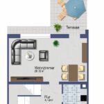 Gegenüber vom Eingang befindet sich das ca. 28m² große Wohnzimmer mit Zugang zur Westterrasse. Die großen Fenster und die gute Raumaufteilung machen diesen Raum zu einem Highlight.